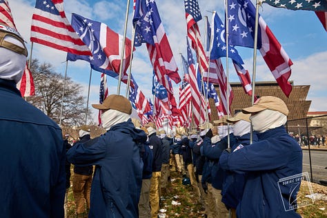 But they looked like a bunch of dorks cosplaying in airsoft gear. They wore variations of the same colored tacti-cool gear (like khaki 5.11 pants that still have their original pleats, or RothCo boots). Rather than brandishing painted trashcan shields, they stood by the Washington Monument trying to look spooky with Betsy Ross flags. A couple were trying to mingle and pass out flyers to March attendees and Trump sycophants shuffling to the rally.