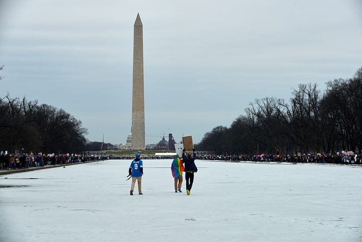 A number of families in red hats quickly scurried away from the march. They wanted nothing to do with these radical-socialist-fascist-marxist-feminist huns. They jiggled ahead of the crowds on the National Mall, American flag sneakers slipping and sloshing in the mud and ice.