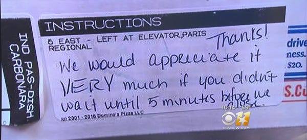 A Domino's customer in Texas ordered a pizza five minutes before closing time. The pizza was delivered quickly and correctly. So what's the problem, you ask? That it came with the above "rude and insensitive" note, which has the customer "outraged." Take it away, Customer's-Friend-Who-Is-The-Worst: