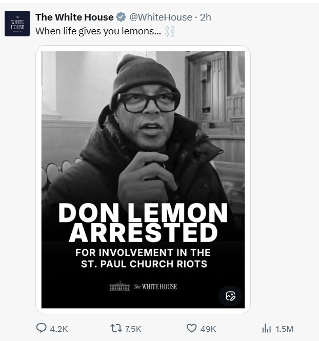 Don Lemon hits seven of those qualifications. (We have no idea about his taste in interior decorating.) So now the Department of Justice has arrested him, along with local Minneapolis journalist Georgia Fort (also Black!), for the crime of covering a protest that the administration dislikes. Ain’t freedom of speech grand? We eagerly await Bari Weiss’s strident defense of Lemon.