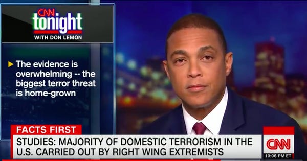 "Well, tonight I want to talk about some uncomfortable truths: the truth about who really carries out domestic terror attacks in this country," Lemon began, before reminding viewers of his original remarks. "I said that the biggest terror threat in this country comes from radicals on the far right, primarily white men. That angered some people. But let's put emotion aside and look at the cold hard facts. The evidence is overwhelming."