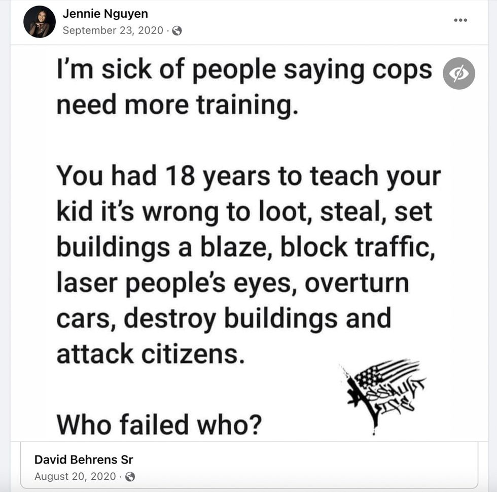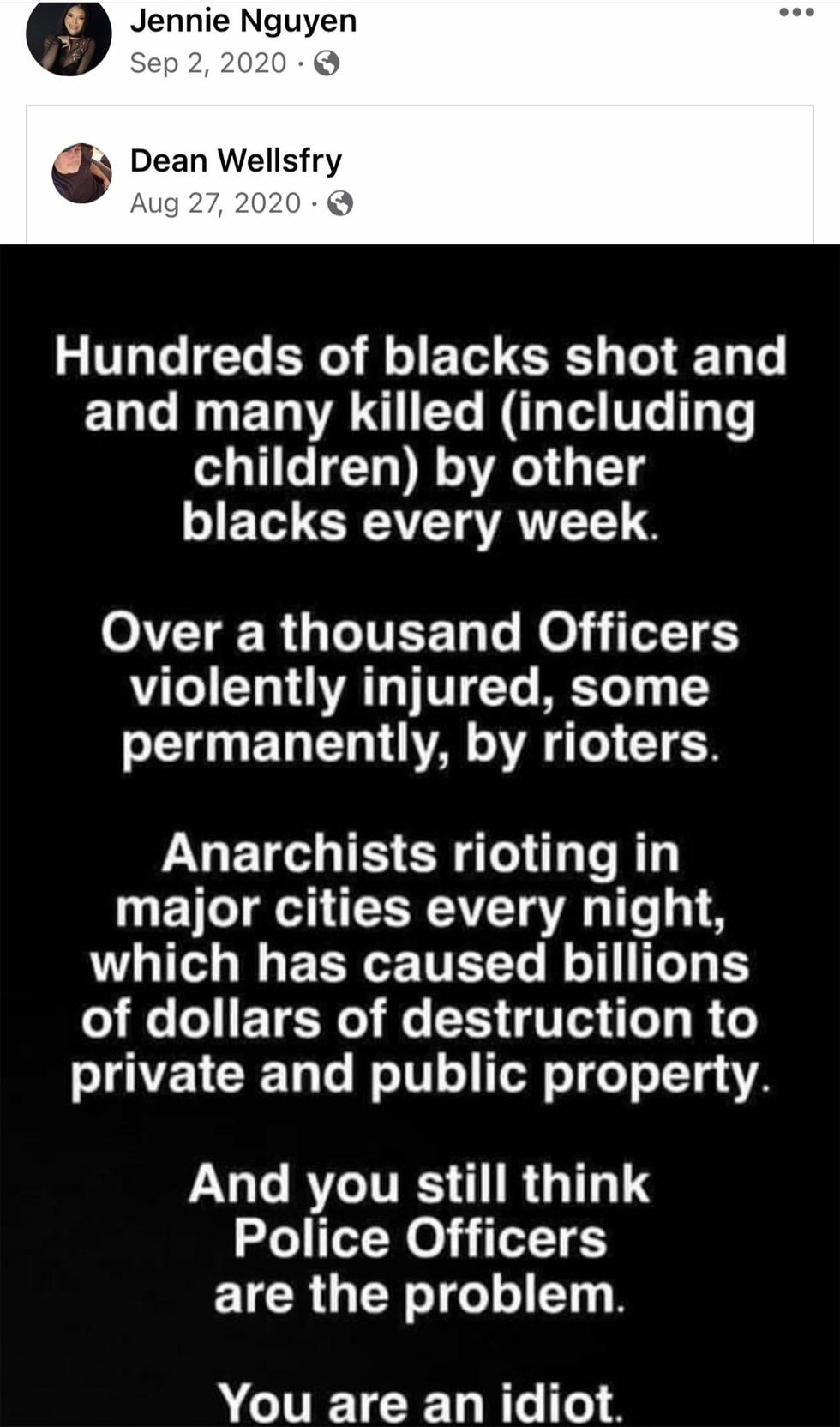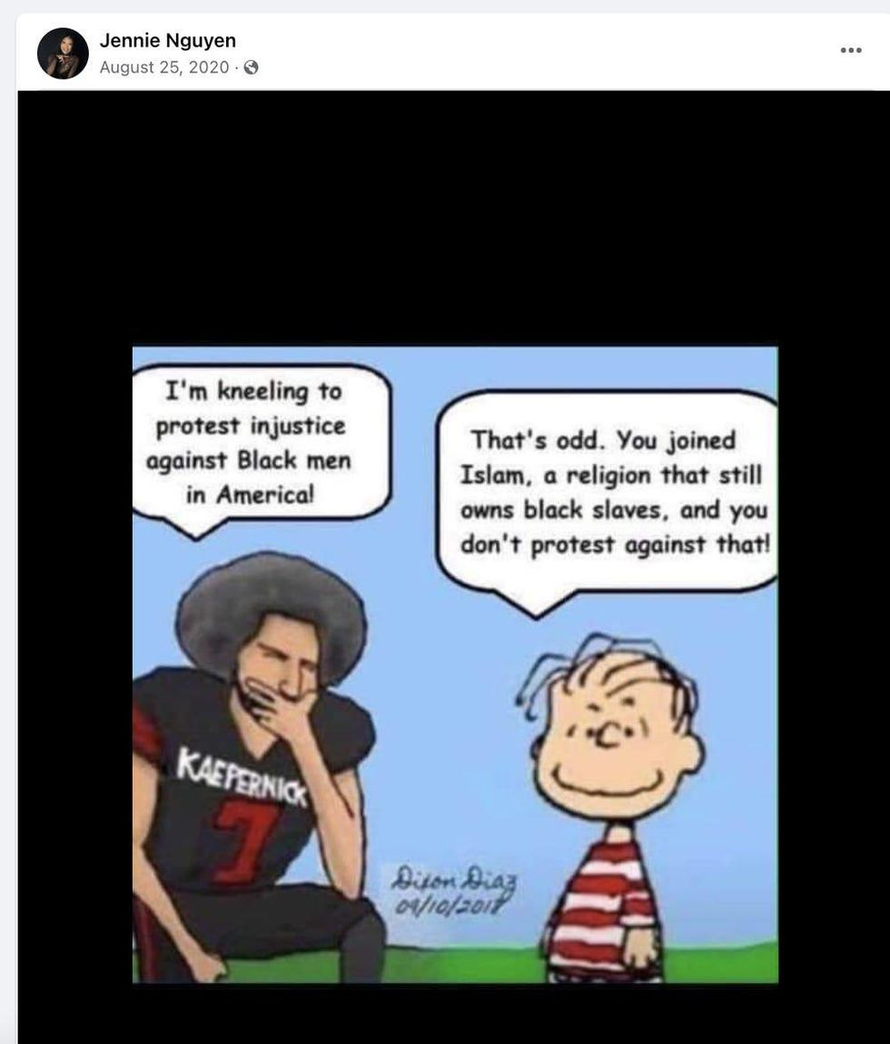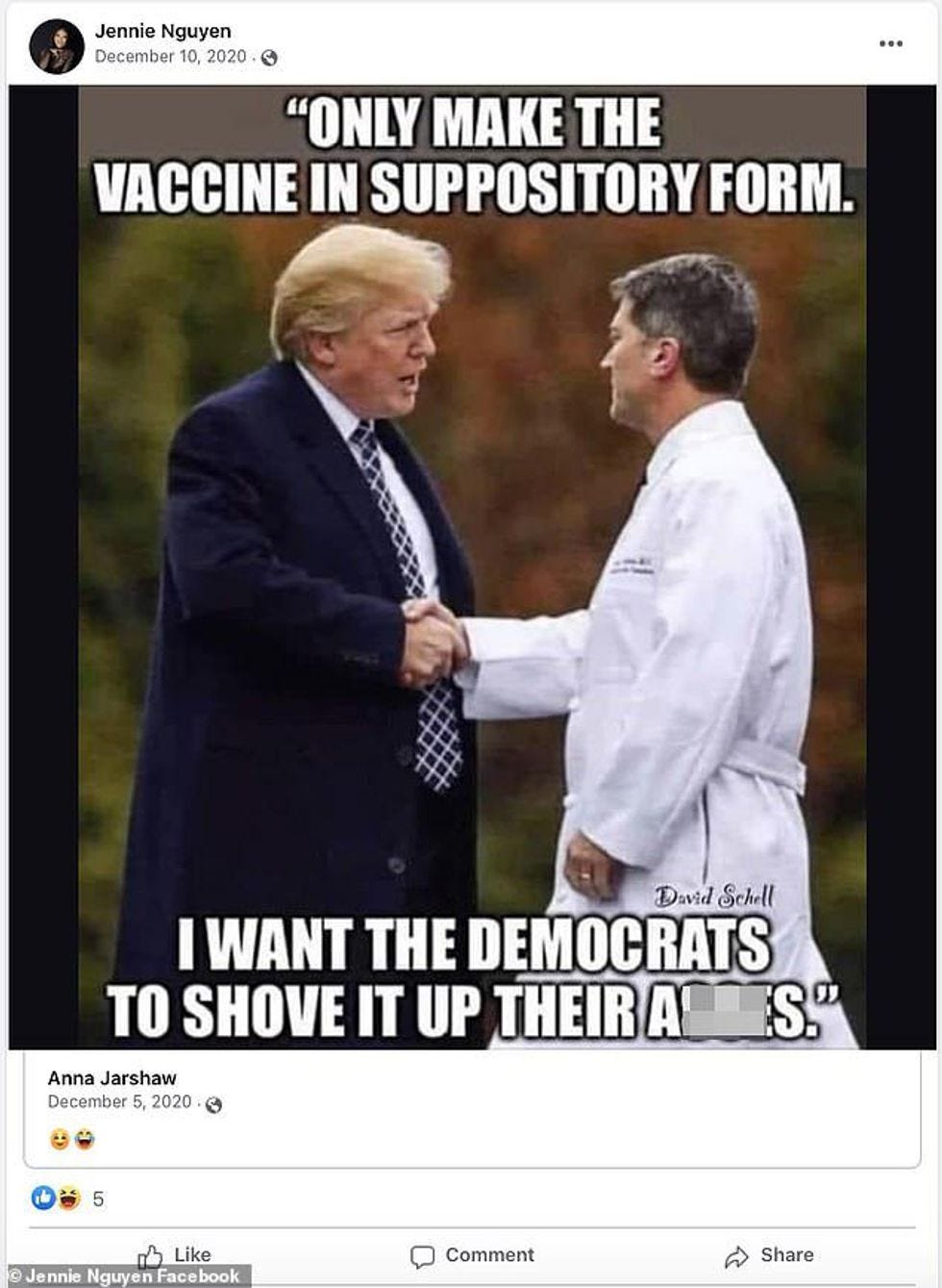 Yeah. They're bad. Really, really bad. On top of those posts, Nguyen also shared a number of gross pro-Trump posts and anti-vaccine posts, including one that ended up being ironically prescient.