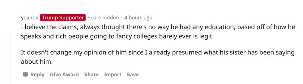 I believe the claims, always thought there's no way he had any education, based off of how he speaks and rich people going to fancy colleges barely ever is legit.