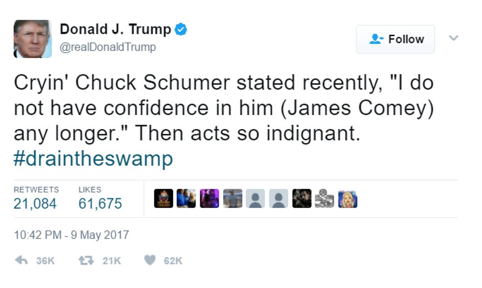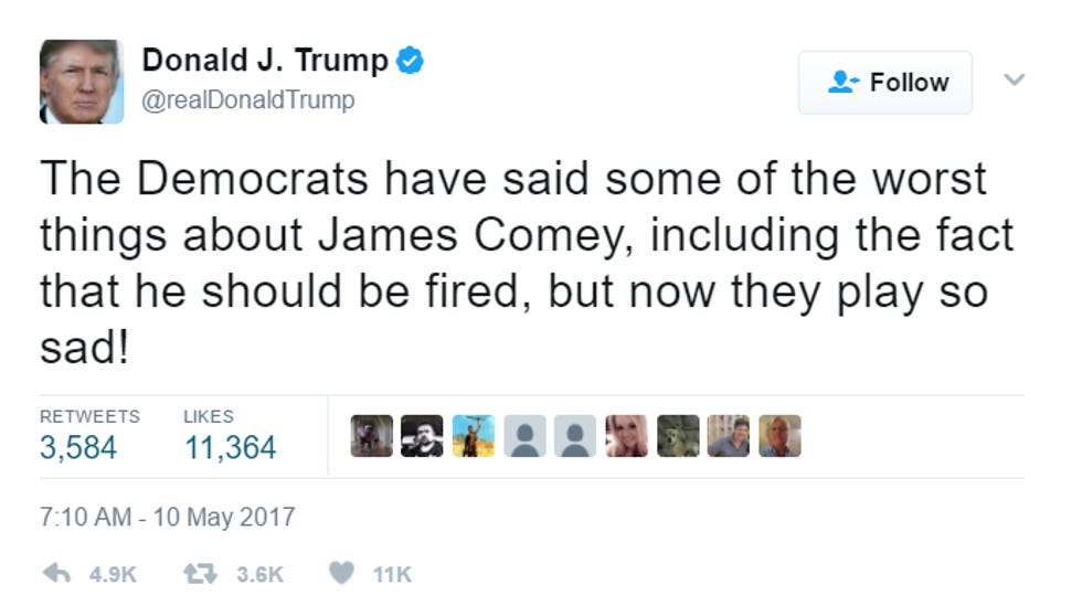 He's stupider than you are. He's stupider than we are. He's stupider than the majority of the United States population, and he's certainly stupider than James Comey, whom we wrote about yesterday hours before his firing, wherein we floated a theory we're even more certain about today, that despite some grave missteps, he's actually a good guy who was trying to do the right thing and lead a true and credible investigation into Trump's Russian ties.
