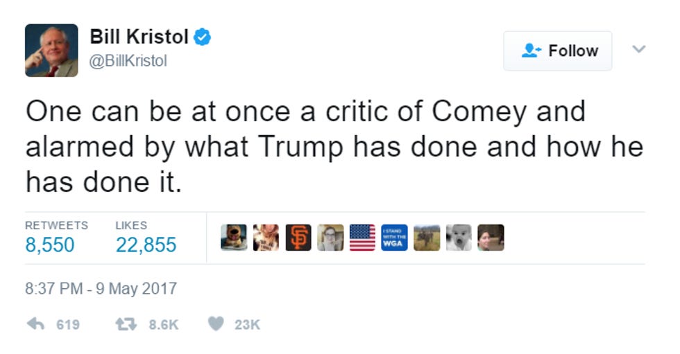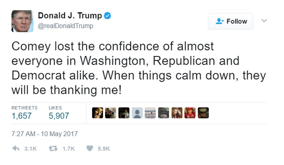 In short, we are supposed to believe that Trump fired Comey for the very same reasons Trump used to love Comey. And we're not supposed to notice that this is the third person Trump has fired (after Sally Yates and U.S. Attorney Preet Bharara) who just so happened to be sniffing out crimes in the Trump/Russia/financial crimes/espionage scandal. Huh!