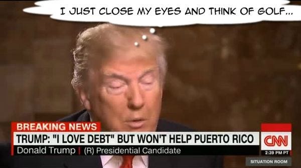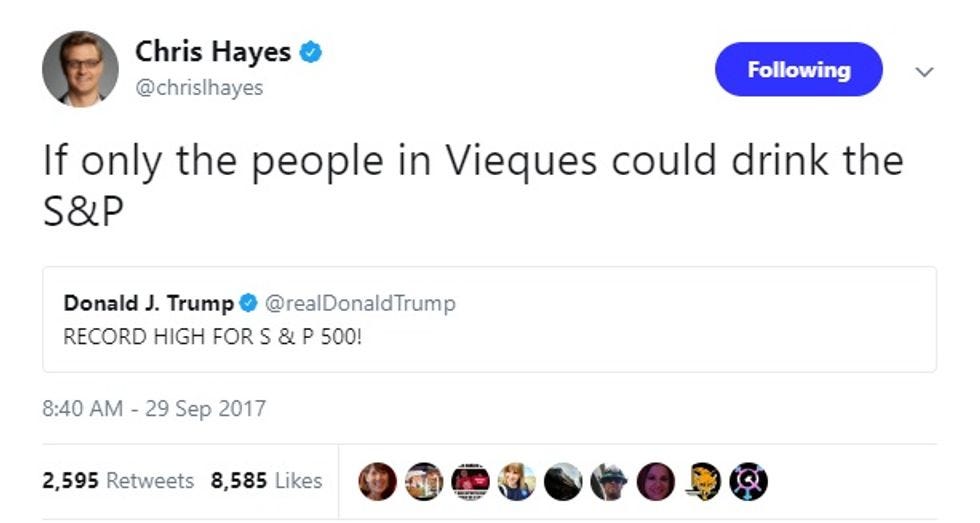 Still, the task of getting the president's attention appears to have finally been accomplished, because this morning, in addition to the terrific news about the S&P, Trump also pointed out that Puerto Rico's governor thinks he's just the best. Too bad we can't really afford to help too much, because come on, helping Puerto Rico is expensive: