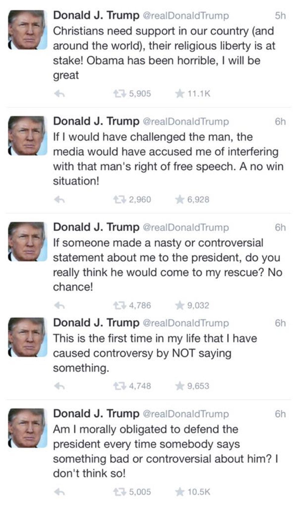After vanishing for a couple of days to take care of an important "business transaction" (it did not involve buying a clue, we'll guess), Donald Trump finally addressed hisfailure to correct or even react much to a supporter's assertions last week that Barack Obama is a Muslim and "not even an American," and that there are jihadi training camps all over America. In a series of tweets, he fired back in typical Trump fashion, portraying himself as the real victim of all the meanies who thought maybe he had an obligation to tamp down his moron supporters' more insane tendencies. In fact, he liked them so much that he copied them and sent out another tweet of the whole string, for easy reading: