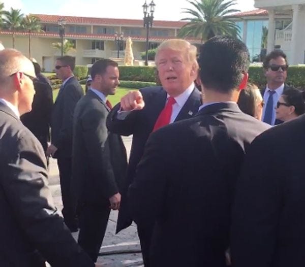 So here is a mystery! Bloomberg Politics reporter Jennifer Jacobs asks Donald Trump in Florida if he still thinks the election will be stolen from him, and Trump enigmatically replies, while shaking a perfectly normal-sized finger at the impudent reporter, "Ask Obama! Tell him to look at his tape when he was running 8 years ago."