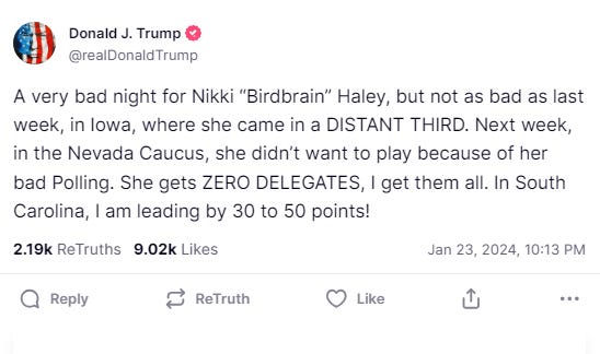 “A very bad night for Nikki ‘Birdbrain’ Haley, but not as bad as last week, in Iowa, where she came in a DISTANT THIRD. Next week, in the Nevada Caucus, she didn’t want to play because of her bad Polling. She gets ZERO DELEGATES, I get them all. In South Carolina, I am leading by 30 to 50 points!”