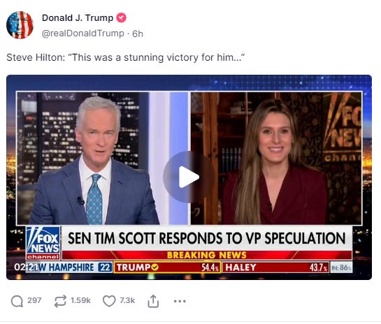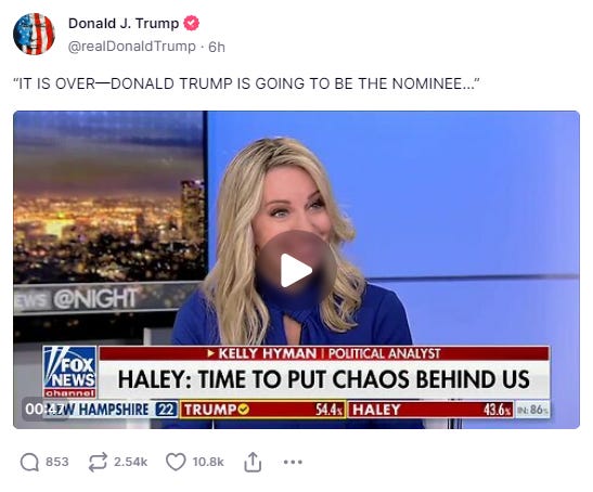“Could somebody please explain to Nikki Haley that she lost - and lost really badly. She also lost Iowa, BIG, last week. They were, as certain Non-Fake Media says, ‘CRUSHING DEFEATS.’”