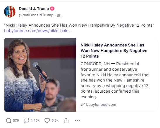 Oh yay! The Babylon Bee wrote one of its Funny Articles! It says “Nikki Haley Announces She Has Won New Hampshire By Negative 12 Points!”