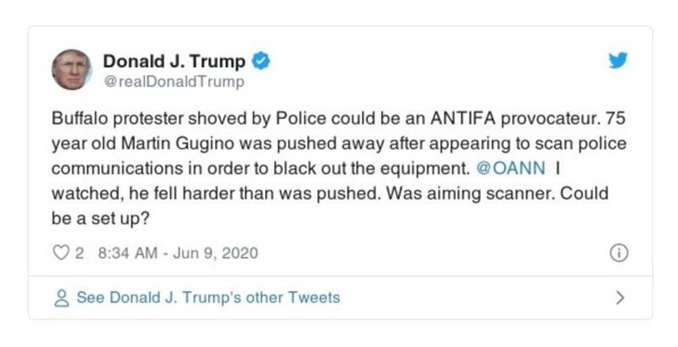 Donald Trump did his part to help heal America today, tweeting very compassionately about Martin Gugino, the 75-year-old peace activist who suffered a concussion and head lacerations after cops in Buffalo shoved him, causing Gugino to hit his head on a sidewalk. Trump's words of comfort and reconciliation explained to an uneasy public that this sort of thing has no place in America, because Gugino just might have been an Antifa terrorist who deserved what he got and more: