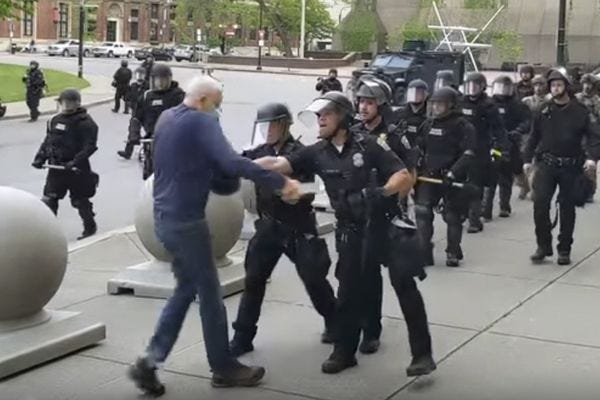 Police initially claimed Gugino "tripped and fell" all on his own, but after the video went viral, the two cops who'd shoved him were suspended, which upset other members of their special head-cracking squad enough that they resigned from goon duty, but not from the force. The two policemen have since been charged with second-degree assault; they pleaded not guilty and are out of jail. Buffalo Mayor Byron Brown sorta-kinda condemned the cops' shoving Gugino, but also called him an "agitator" and went on the Rachel Maddow Show to explain that it's just fine that one cop prevented another from checking on Gugino, who was bleeding profusely from his ear, because their orders required them to maintain formation so they could break up a crowd of one other guy on the sidewalk. Besides, there were medics who came along moments later to tend to Gugino.