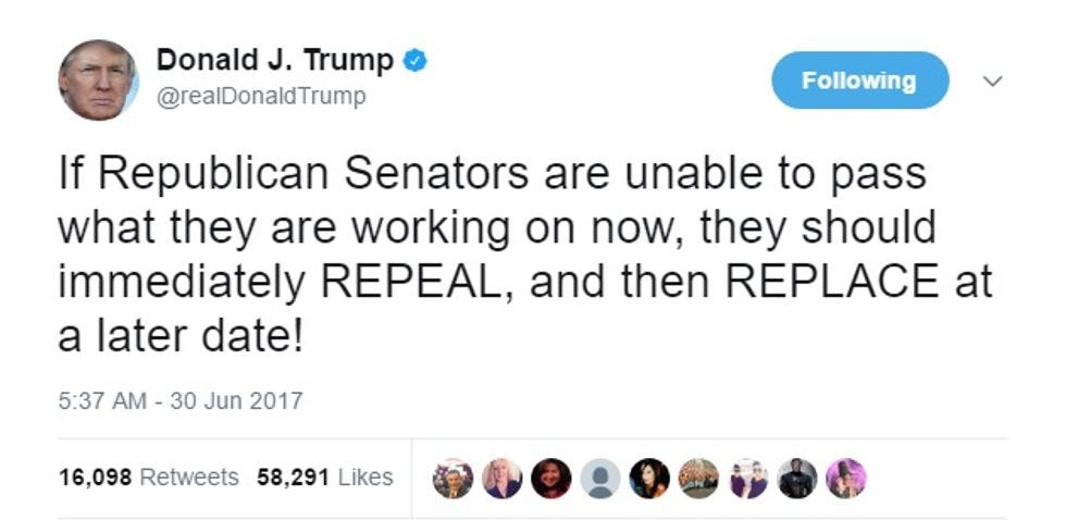 Never let it be said that momentary distractions like having a Twitter meltdown about Mika Brzezinski’s bleeding faceparts or a meeting with the president of South Korea can keep Donald Trump's eyes off the prize. Just two days after assuring Americans that the Senate was on the verge of passing "a great healthcare at a reasonable cost" (also "a healthcare that will be a fantastic tribute to your country”) and promising "a great, great surprise," from the senators revising the Better Care Reconciliation Act so it can somehow win support from the moderates who hate it and the rightwingers who hate it more, Trump signaled that he's also ready to just give up because it's hopeless: