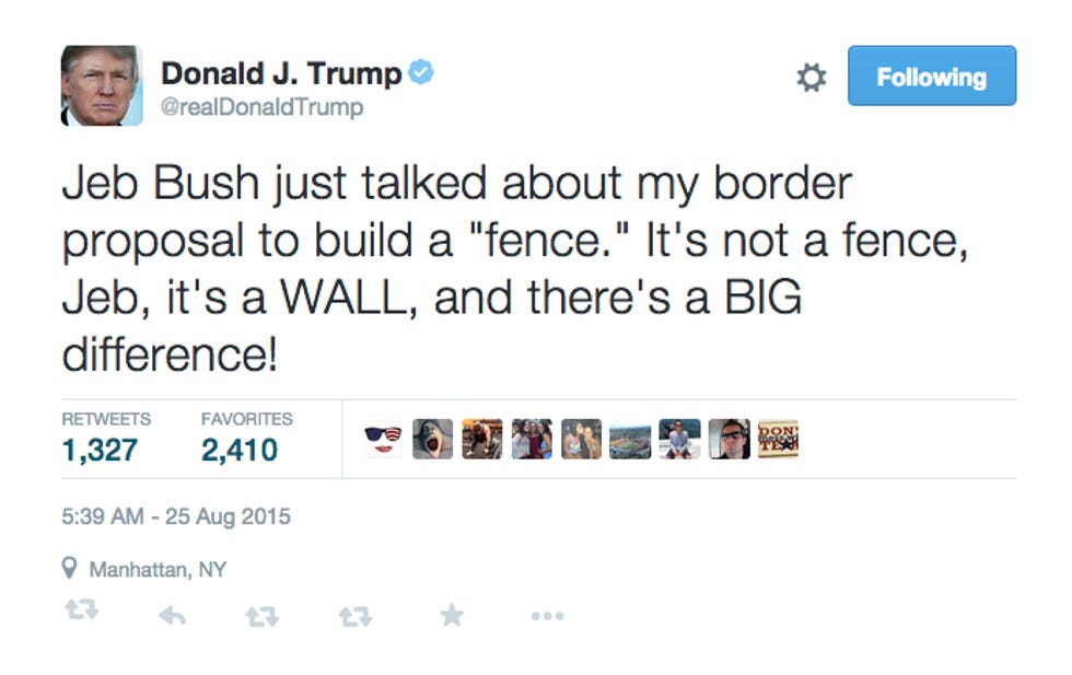 Good sick burn, Trump! Don't forget to humiliate this loser dummy on the fence-wall distinction while you're at it: