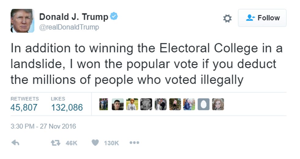 OH YEAH? MILLIONS OF ILLEGAL VOTES? Well golly gee good gravy, shouldn't there be a recount, to weed out the MILLIONS OF ILLEGAL VOTES that denied Trump his YOOGE POPULAR VOTE WIN? Wouldn't you think that would be a good idea? Unless the man is tweeting lies directly out of his bunghole, which is what he is doing, because it's one of his favorite things to do. It's even better than eating Trump Taco Bowls and ogling his daughter Ivanka's ass, you bet!