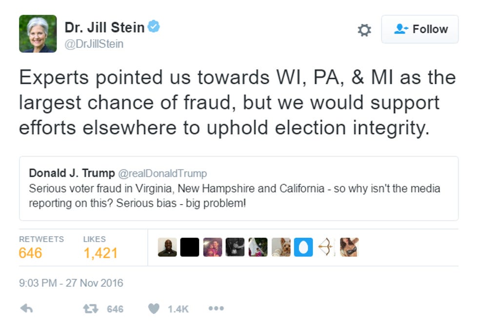 To be honest, we are not sure why Jill Stein is doing recounts in the "blue wall" states, Wisconsin, Pennsylvania and Michigan, all of which Donald Trump (ALLEGEDLY!) won in little squeaker races. Is she trying to save her soul, because she knows deep down that she may have ruined America by siphoning votes from Hillary? Maybe . Is she really, for serious, very worried about the integrity of all U.S. American elections, and really, truly wants to enact reforms to make sure they are free and fair, as her Twitter timeline suggests? Also maybe . Did Hillary Clinton call Dr. Stein on her Obamaphone and threaten to introduce her to Hillz's little friend Ben G. Hazi, if Dr. Stein refused to do her this tiny favor? Probably .