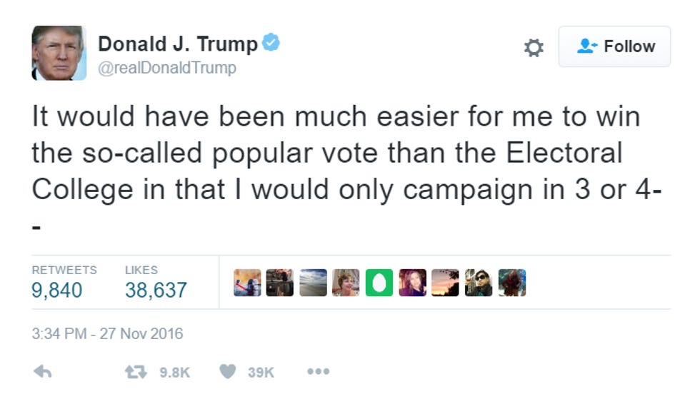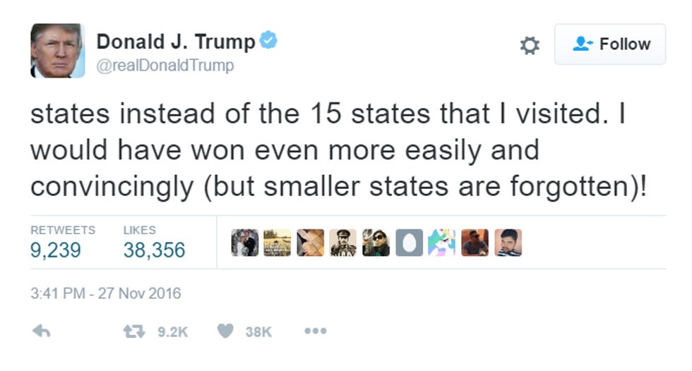 Donald Trump, who won the election despite losing by a zillion in the popular vote, seems spooked, though. Let's go to the latest press statements from the press office of the president-elect of the United States, by which we mean Trump's Twitter account, which America really needs to fucking unfollow and mute and block: