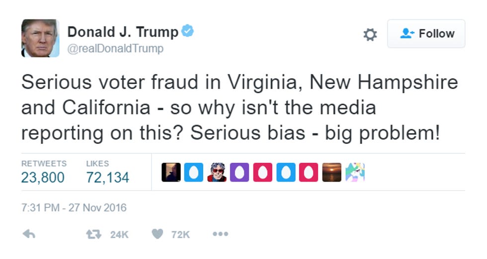 So, it's apparent that these recounts are getting all the way under Trump's skin, and he is obsessed with them. He spent the rest of the weekend on his Twitter, quoting Hillary saying the electoral process should be respected, yadda yadda, seemingly forgetting that she didn't call for the recounts in the first damn place. Is Trump worried about what they are going to find? He sure did spend a lot of the campaign season telling us the election was going to be #RIGGED. Wouldn't he want to know if his alleged victory is, in fact, valid?