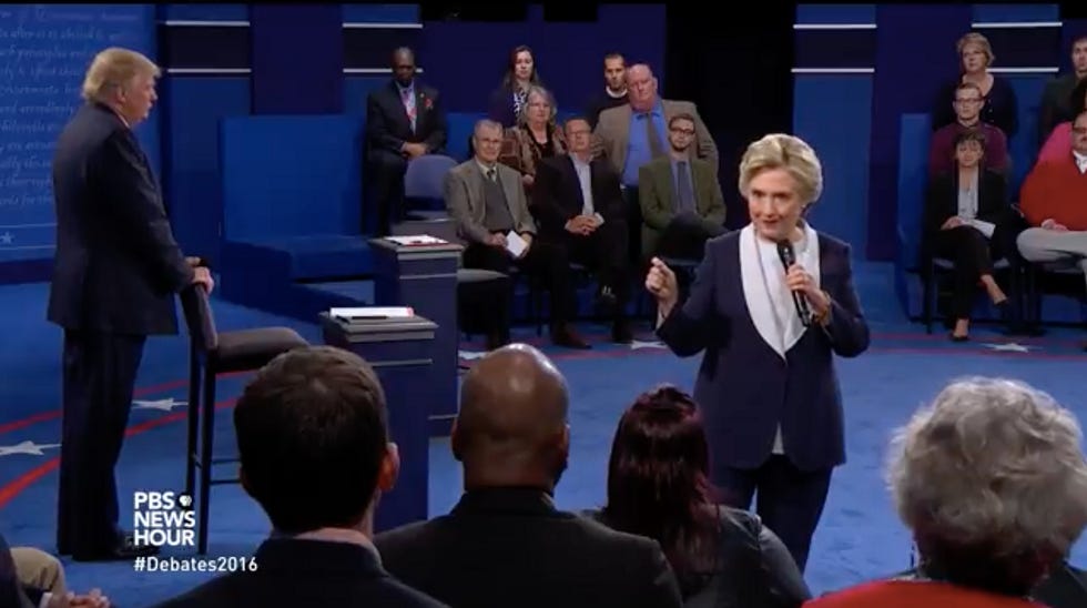 9: 22. Hillary Clinton says Donald Trump doesn't answer questions, or talk about policy, but instead of responding at all to the allegations about Bill or the woman whose rapist she (Hillary) defended (as a court-appointed attorney). Instead, she talks about all the people Trump insults. Mistake? Feels like it. Feels evasive, and like they couldn't figure out a reply at all.