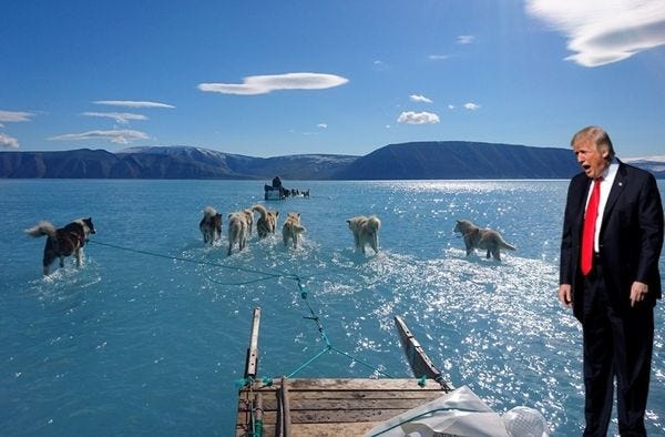 We have no doubt this will eventually be traced back to some lunatic shit on Fox News, or an aide's printout of a story from Wingnut crazypants media, or perhaps a chance comment Mike Pompeo made back in May when he cancelled a planned trip to Europe to help prepare for war with Iran. That trip was supposed to include a stop in Greenland, where he could have seen evidence of global warming, even though it's only a Chinese hoax. Maybe Pompeo told Trump his pet theory that the disappearance of Arctic sea ice is the greatest thing ever, because new trade routes.