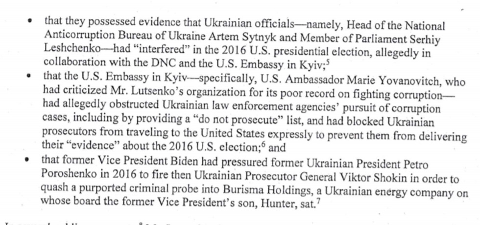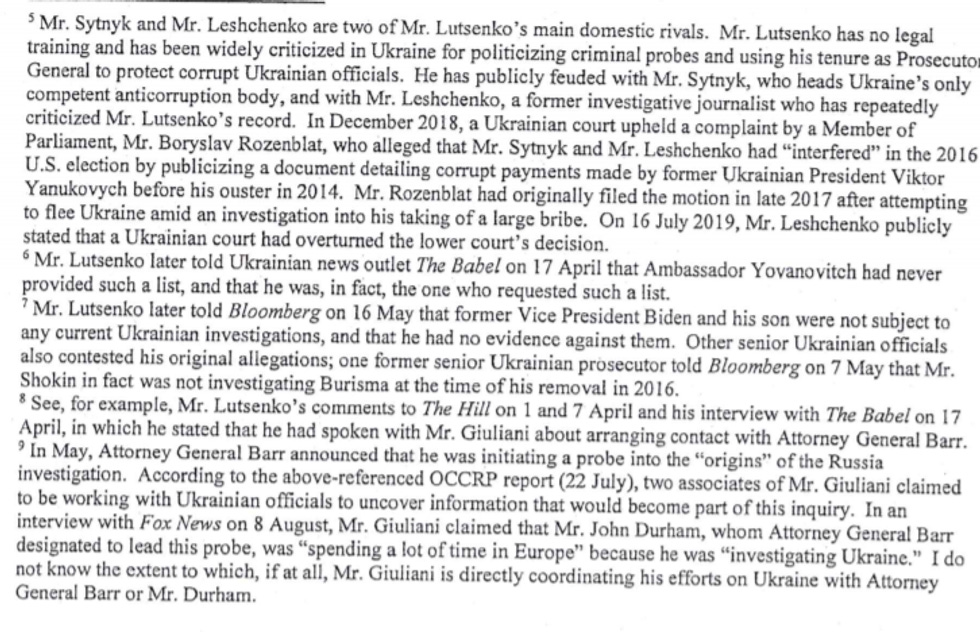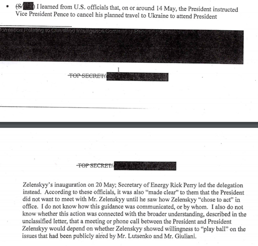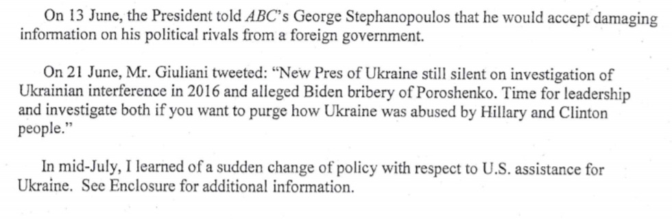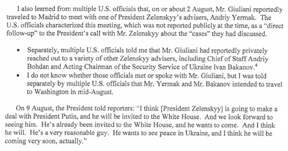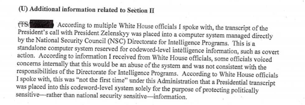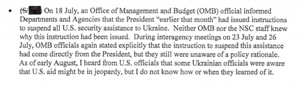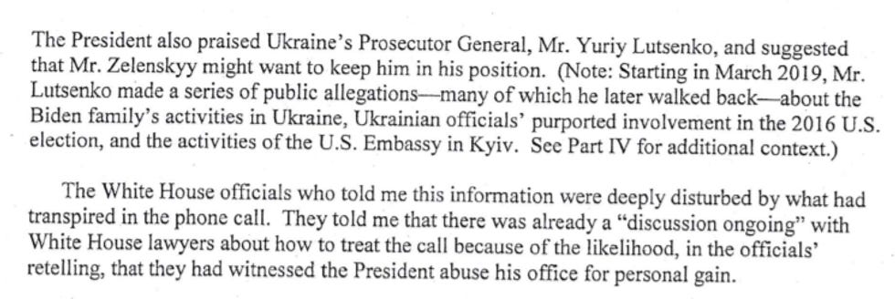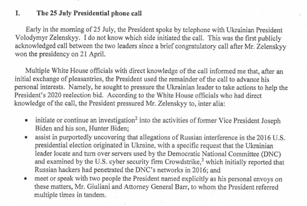 2: 19:Page 2, we get to the July 25 phone call between Trump and new Ukrainian president Volodymyr Zelenskiy. WB acknowledges they didn't personally hear the phone call, but that's OK, we have a truncated and edited version of the transcript, and it completely lines up with what's in this report. (Republican idiots tried to draw a distinction between the two during this morning's hearing. It was stupid, and they have nothing.)