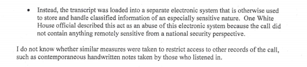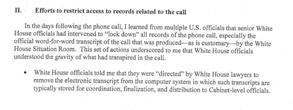 AND THEN: "White House officials told me that they were 'directed' by White House lawyers to remove the electronic transcript from the computer system in which such transcripts are typically stored for coordination, finalization, and distribution to Cabinet-level officials."