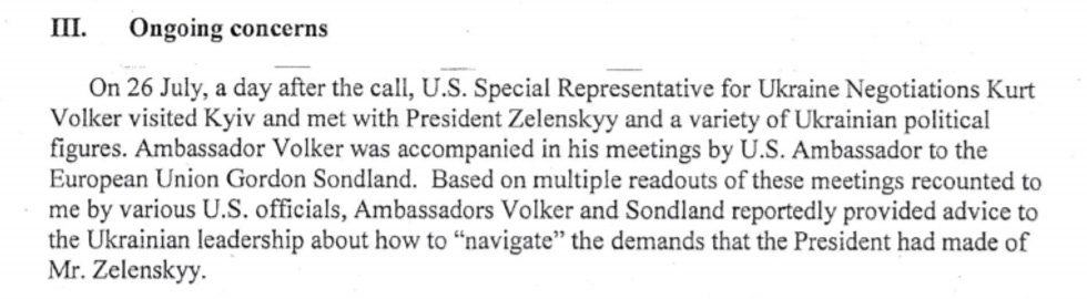 The day after the phone call, US Special Representative for Ukraine NegotationsKURT VOLKERwent to Ukraine to see Zelenskiy and a buncha other folks. Volker went with US Ambassador to the EUGORDON SONDLAND . According to readouts of the meetings, they "provided advice" on how to "navigate" all the extortion orders Trump had barked at Zelenskiy.
