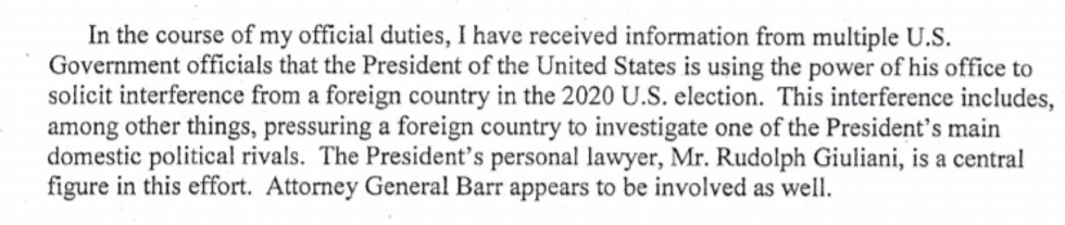 1: 57:OK, first page, first full paragraph, we get the crux of it, which is that the whistleblower has "received information from multiple U.S. government officials that the President of the United States is using the power of his office to solicit interference from a foreign country in the 2020 U.S. election. This interference includes, among other things, pressuring a foreign country to investigate one of the President's main domestic political rivals."