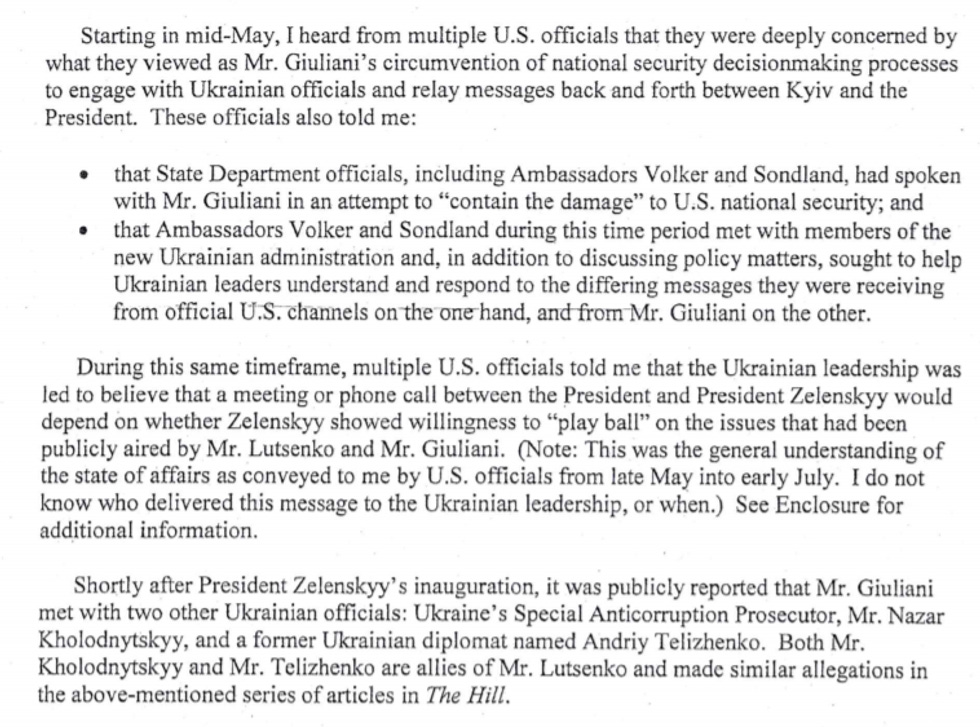 In mid-May, "multiple US officials" were "deeply concerned" about Rudy Giuliani's personal conduct of American foreign policy in Ukraine. They told him Volker and Sondland (SEE ABOVE, the ones who went to Ukraine to tell Zelenskiy how to obey Trump's extortion demands, allegedly ) were talking to Rudy to try to do damage control. According to the WB, some of those guys' contacts with Ukrainians were sort of an effort to help Ukraine "respond to the differing messages they were receiving from official US channels on one hand, and from Mr. Giuliani on the other."