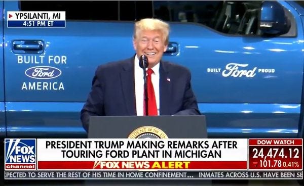 Donld Trump took a trip to Ypsilanti, Michigan, Thursday so he could tour a Ford components plant that's building ventilators and personal protective equipment for hospitals. While he was there, the Great Man refused to wear a mask in public, which violated both Michigan's emergency health law and Ford's company policy. In addition, Trump took time to insist he definitely wants to punish the state for its completely legal absentee voting policy, suggested he'll oppose further stay at home orders if COVID-19 resurges, and took a moment to praise the "bloodlines" of notorious anti-Semite Henry Ford.