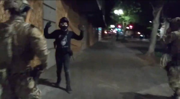 The United States has, effectively, declared war on its own citizens for using their First Amendment rights to protest police brutality. American citizens have been teargassed, disappeared into unmarked vans, arrested without cause, and critically injured at the behest of the Department of Homeland Security. Officers from the US Marshals Special Operations Group and Customs and Border Protection's BORTAC have been sent, supposedly, to protect a federal courthouse from supposed "violent anarchists" who might "graffiti" it, and this is the way they are handling that mission.