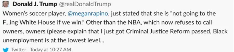 Let's start with the fight he's trying to wage with US soccer star Megan Rapinoe, who in a now-viral video stated that she has no fuckin' interest in going to the White House to meet that idiot. He got into a quarrel with her on Twitter ... or at least with a Twitter account that didn't belong to her. It's now been replaced, in order that the adult president may shit-tweet at the soccer superstar who hurt his feelings, but Splinter grabbed the original: