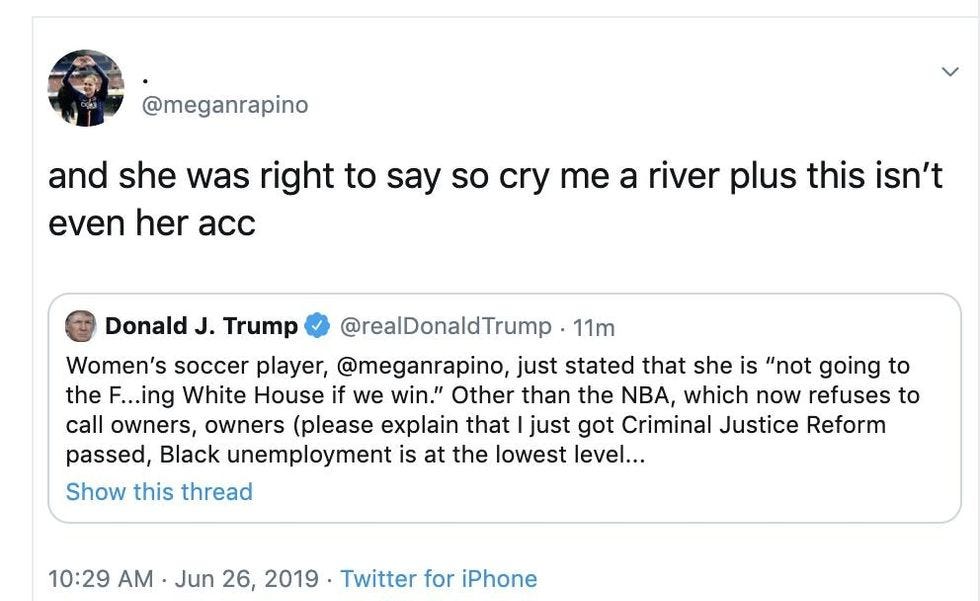 By the by, the owner of the incorrect Megan Rapinoe account saw Trump's whining and told him to grow a dick and set it on fire: