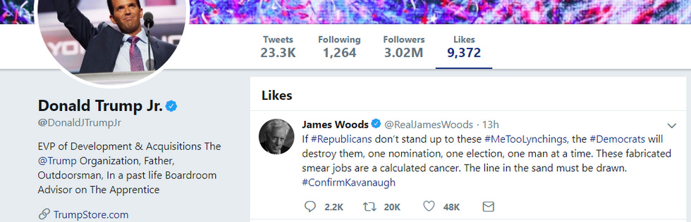 Dipshit Junior also liked this tweet from James Woods, who called what is happening right now a #MeToo "lynching," because that's not racist or nothin':