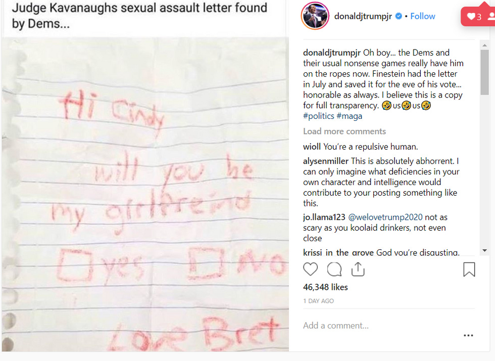 First, there was the Instagram post, where Junior LOLed a whole bunch about how he found the "real" letter the woman we now know is Christine Blasey Ford sent to Dianne Feinstein: