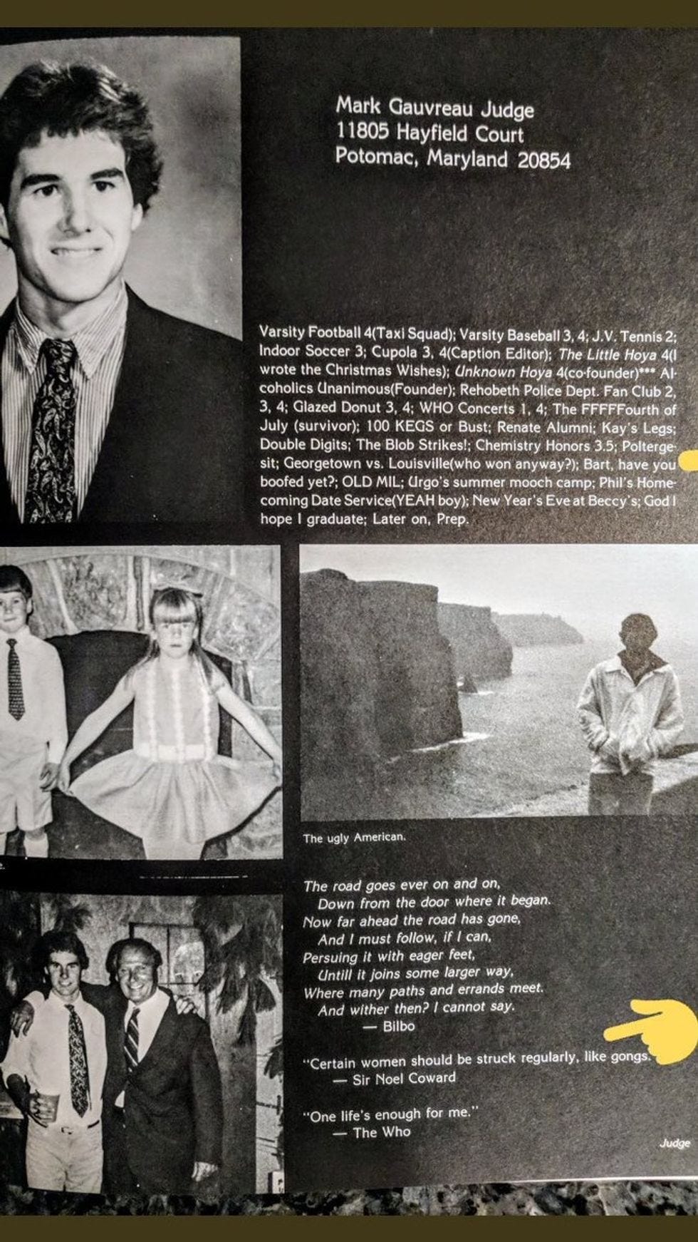 Kavanaugh, we are guessing, was "popular" in that he was a partier and he spent a lot of time with his "bros," and they probably jacked off in a big circle in their parents' basements only sometimes. They had access to drugs and Natty Light, but secretly, deep down, they were incredibly jealous of Trevor and Rob and Johnny and Johnny's Camaro, because what makes those guys so great anyway? GRANTED, Trevor's ass is perfect and Rob's eyes can make any human melt and Johnny has that Camaro (and is hung like a wild horse), but NO FAIR, WHY THEY GET ALL THE GIRLS? Anyway, we are just saying Brett Kavanaugh's friend group was probably the type that knew where to buy GHB before anybody else at school even knew what that was. Just look at his pal Mark Judge's yearbook entry.