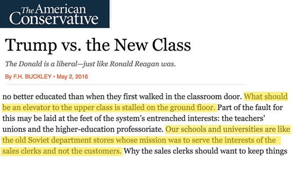 And yes, here's the article in question, "Trump vs. the New Class," by F.H. Buckley (no relation), a rousing defense of some parts of Donald Trump Sr.'s supposed "liberalism" against the entrenched privilege of the conservative elites. And it really does have those lines from the speech in it.