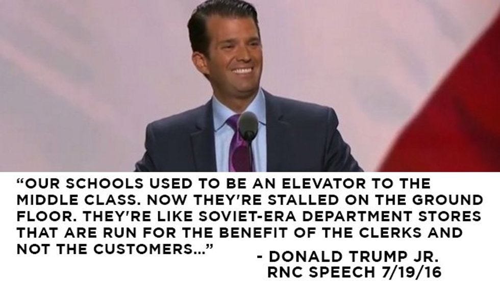 In any case, we're rather astonished that nobody else seems to have noticed the remarkable similarities between Donald Trump Jr.'s speech and Fluttershy's critique of the Equestrian educational system in this one fanfic we read a while back...