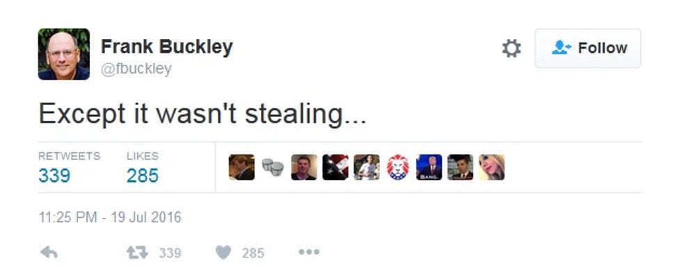 Problem is, this time the Trump campaign won't even have to do a Google search for lines from "My Little Pony" to claim the metaphor got there through pure coincidence. It wasn't a coincidence at all, asTalking Points Memo found out with just a teensy bit of asking around: The author of the article for The American Conservative, F.H. Buckley (no relation), was actually Trump Junior's principal speechwriter, so the elevator and department store metaphors came from the same guy. That's not plagiarism, that's authorial recycling, and it ain't a crime. As Buckley himself tweeted not long after the Daily Show tweet:
