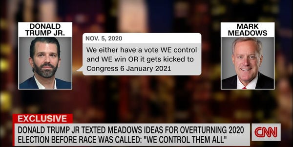 Trump Jr. told Meadows, "We either have a vote WE control and WE win OR it gets kicked to Congress 6 January 2021."