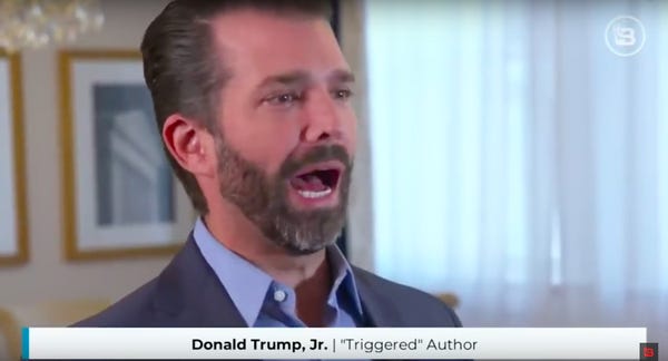 Donald Trump Jr. , who by the grace of God is the president's son and not yours, has long hoped his father might someday at least pretend to love him. Unfortunately, the president doesn't like losers, which Trump Jr. is. But all is not lost for the self-described "son of a rich white guy living in 2019." Trump Jr. finally achieved some measurable success that didn't involve his father sending him to Las Vegas to learn the casino business. He "wrote" a whiny ode to white male grievances called Triggered: How the Left Thrives on Hate and Wants to Silence Us , and it's just topped the New York Times bestseller list.