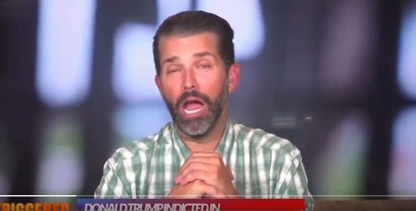 Junior shook his hands around and made more faces like the one above, as he lied and said the "radical leftists of the Washington Post " agree that his daddy's indictments are bogus. (Nobody has read his daddy's indictments.)