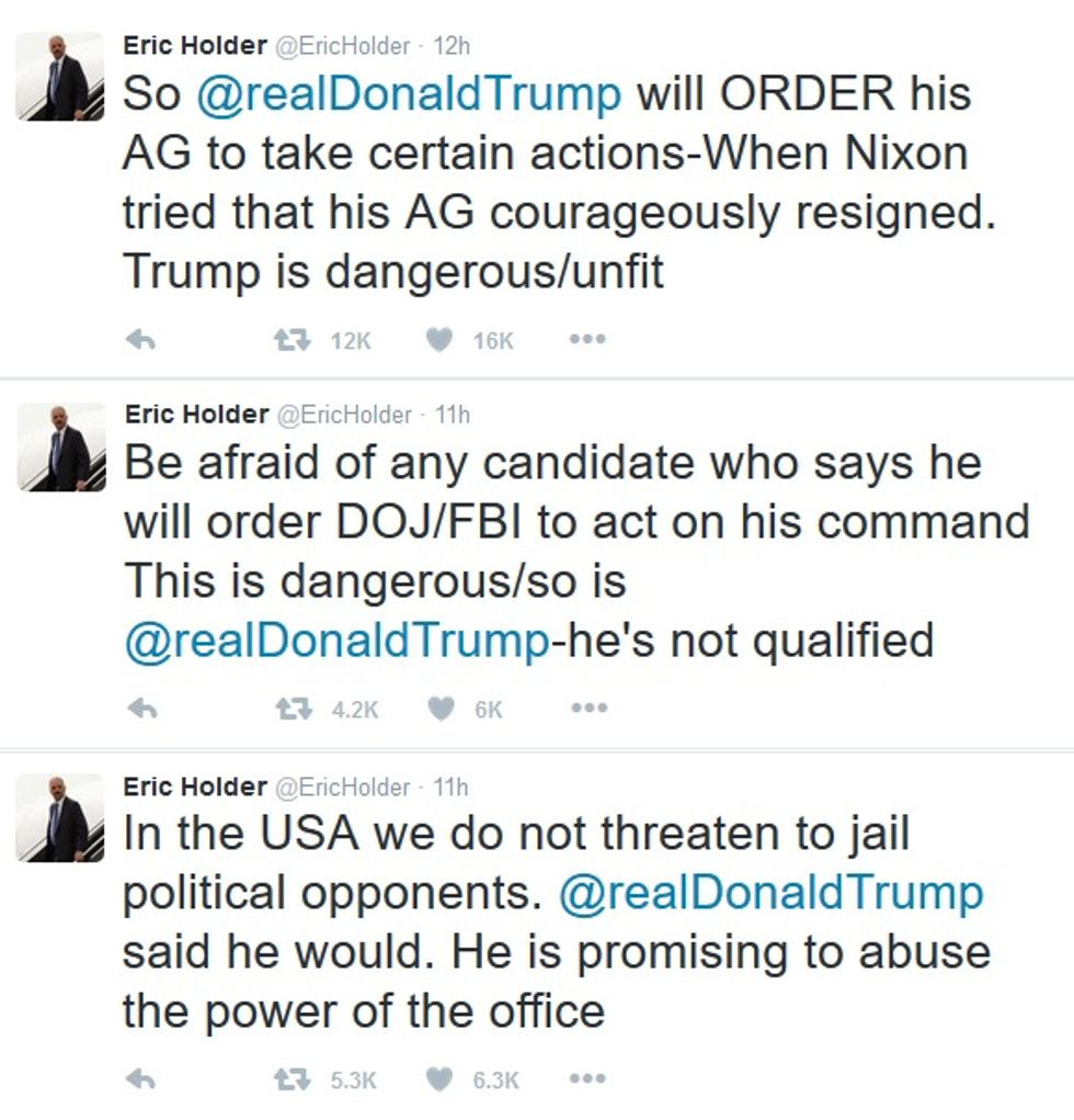 Former Attorney General Eric Holder was driven to post a brief Twitter Treatise on the matter:
