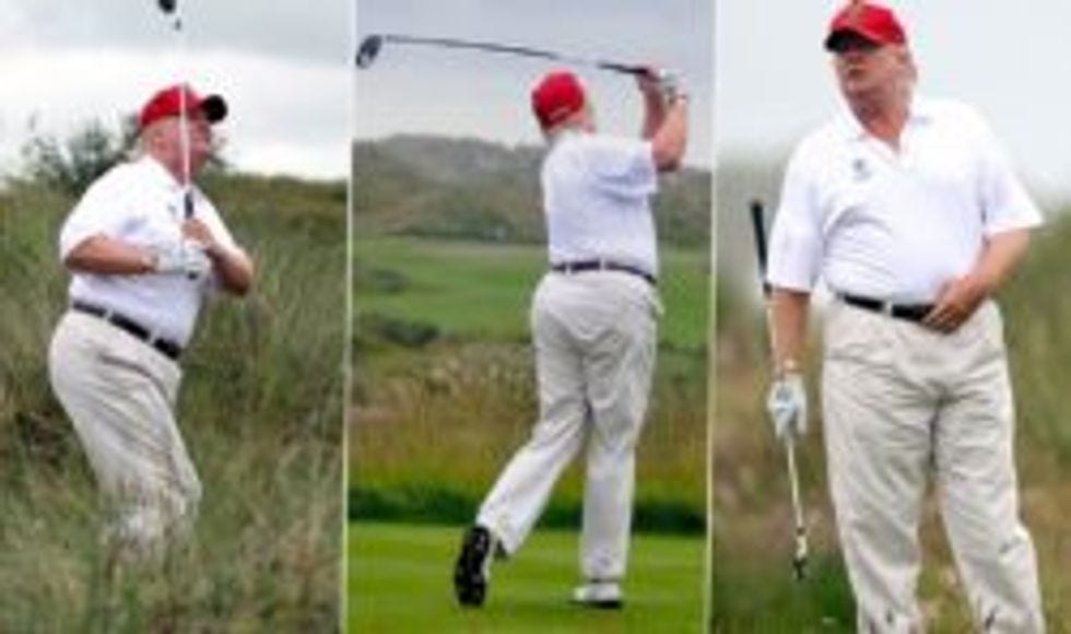 For showing the world that we must not be consumed by grief and fear. Even while you labored to save theindebted losersdisaster victims in Puerto Rico, you found time to hit the links seven times since Hurricane Maria . Even in the midst of crisis, our brave president soldiers on.