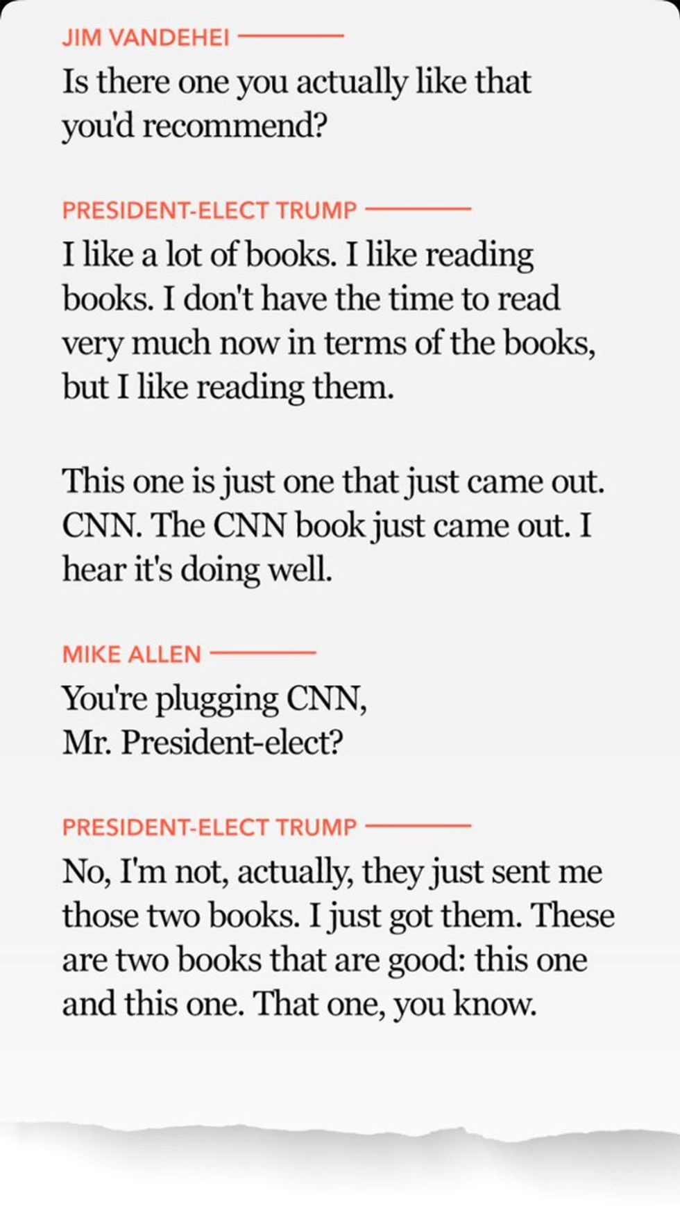 In case you're Donald Trump and that excerpt is too long, just go with Mr. Hamby's summary: "Q: What books are you reading? A: Look over there. There are some books." We bet he's read them, too, just like he read that terrific book (maybe, in high school) about how it was pretty quiet on the Western Front, very relaxing. And the one with the old man who went fishing, though fishing is not Trump's particular thing, he's not so big on boats. He likes his plane. It's a very nice plane. But sure, he reads books, likes reading them when he has the time, which is not often. He hears the CNN book is doing well, not that he likes CNN, but the book is doing well, and he respects that. Also, look, here is a photo from the Axios article of Trump holding up a book, which makes him a big reader, not that he'd recommend the book.