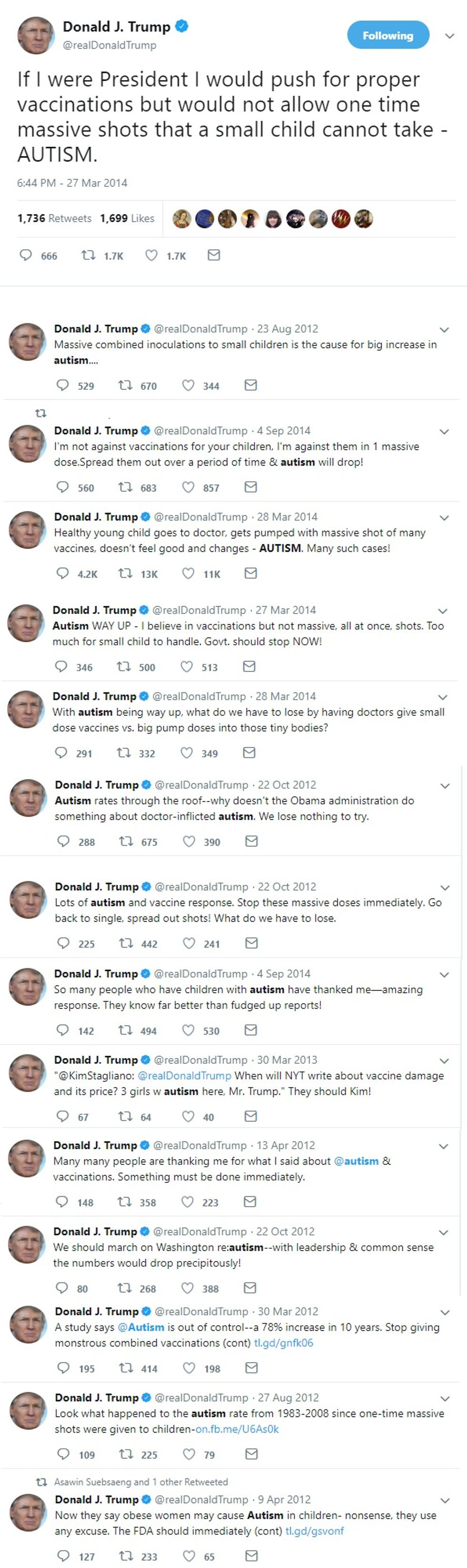 As Media Matters senior fellow Matthew Gertz points out, there's more than just a little bit of irony in Donald Trump's White House issuing a declaration of support for World Autism Awareness Day, given Trump's long dedication to the conspiracy theory that vaccines cause autism. You will not find Donald Trump apologizing, disavowing, or retracting a single one of his many, many, MANY tweets in support of that myth: