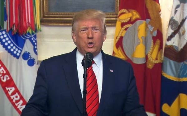 Trump also said the operation had no connection to his recent abandonment of the Kurds in northern Syria, and that he didn't at all regret that he gave the go-ahead for Turkey to invade and drive out the Kurds. Not that he framed it that way; it's just a thing that happened, and it wasn't any of America's business.