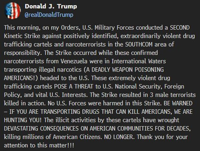 The US military attacked and destroyed a second civilian boat from Venezuela, killing all three people aboard. Donald Trump announced the extrajudicial murders Monday on social media, dressing it up with claims that the (alleged) criminal act of smuggling drugs made it OK for the US military to attack the boat, because only sissy liberals care about little distinctions over who the military is allowed to kill. They’re bad people, or at least the president said they are, and never mind that you enforce the law by interdicting the boat and arresting the smugglers. Those are the old rules (and mere US law), but it’s much more popular to just murder them with drone-launched missiles.