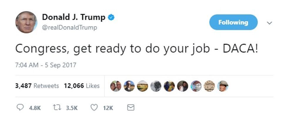 Trump had to make his announcement immediately, you see, because of a completely arbitrary deadline set by a group of nine state attorneys general who planned to sue over DACA if Trump didn't act by today. Because, gosh, if they sued, then Trump's Justice Department would have to defend an Obama policy in court, and that's simply unthinkable.